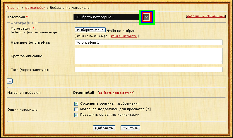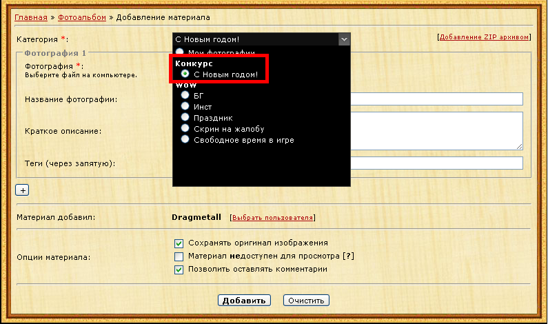 Шаг 7. Пишите название например: НА КОНКУРС). Далее краткое описание, т.е. что там изображено. Добавить.