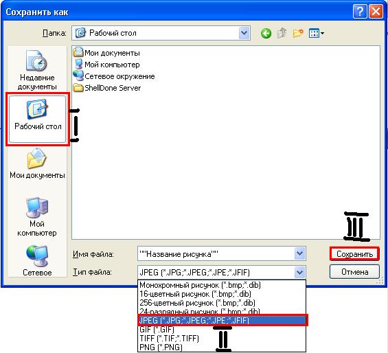 Шаг 5. Сохраняйте ИМЕННО ВОТ ТАК! а то поддерживать не будет!!!! Рабочий стол (I), Выбрать категорию (II), Сохранить (III)