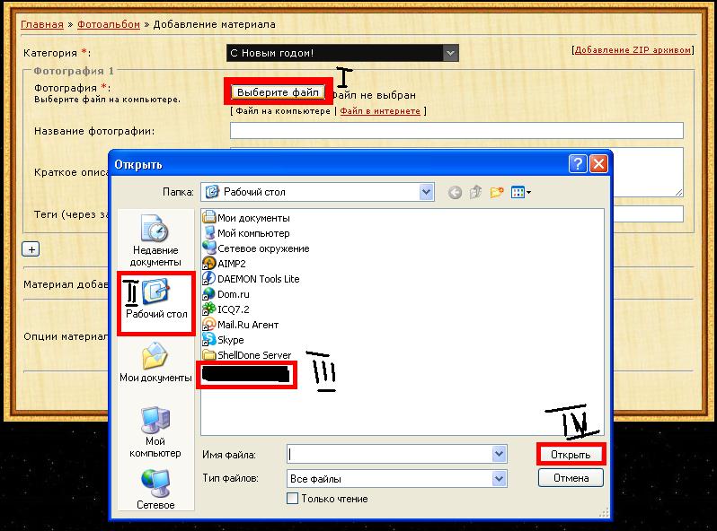 Шаг 6. Нажмите на Выберите файл (I), позже откроется табличка. Нажмёте в табличке Рабочий стол (II) Далее в списке найдёте этот файл (III) ( (открытка). На рисунке он изабражён чёрной полоской. Далее кликаете Открыть